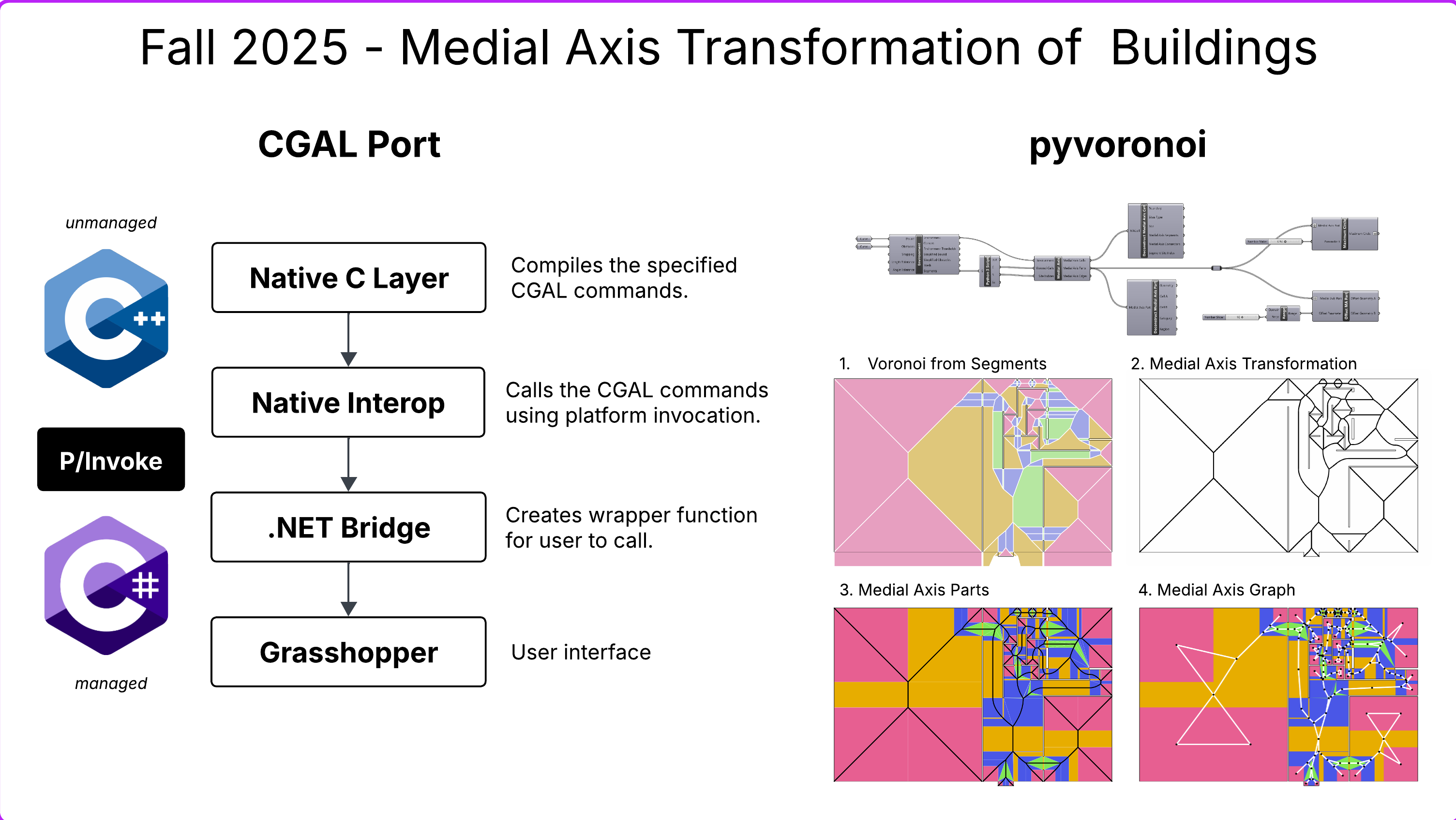 A multi-layered framework bridges native CGAL C++ code into Rhino’s .NET environment: