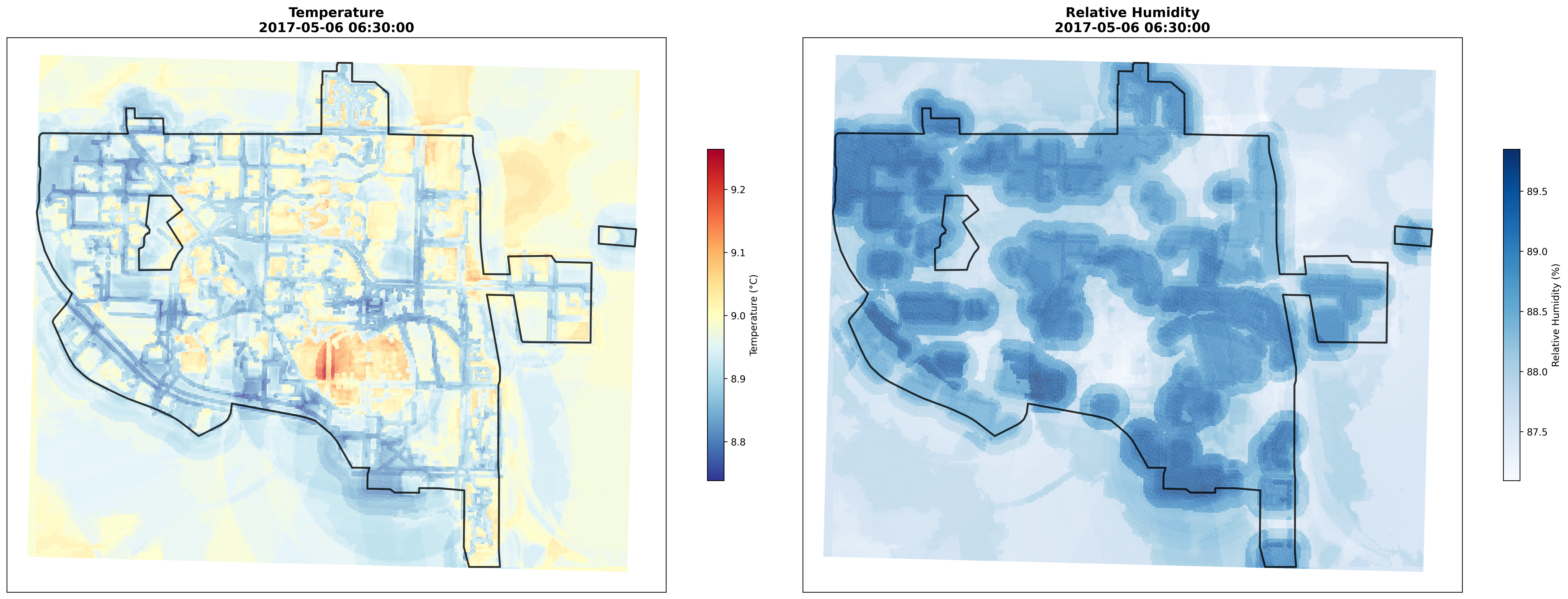 This project combines multiple advanced techniques to predict microclimate weather patterns at Georgia Tech campus with high spatial and temporal resolution. The pipeline integrates FusionLSTM (a TFT-inspired architecture featuring multi-scale LSTM branches with attention) for time series prediction with Regression Kriging to generate campus-wide maps. The model predicts Temperature and Relative Humidity at 100,283 grid points using multi-variate time series and geospatial features.